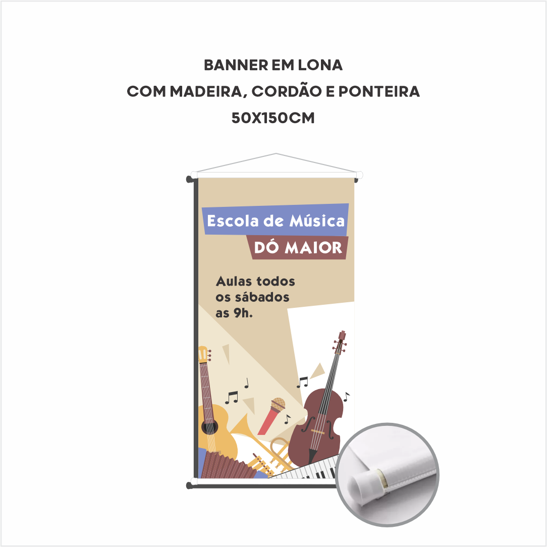 Banner em Lona - 50x150cm - Madeira, cordão e ponteira